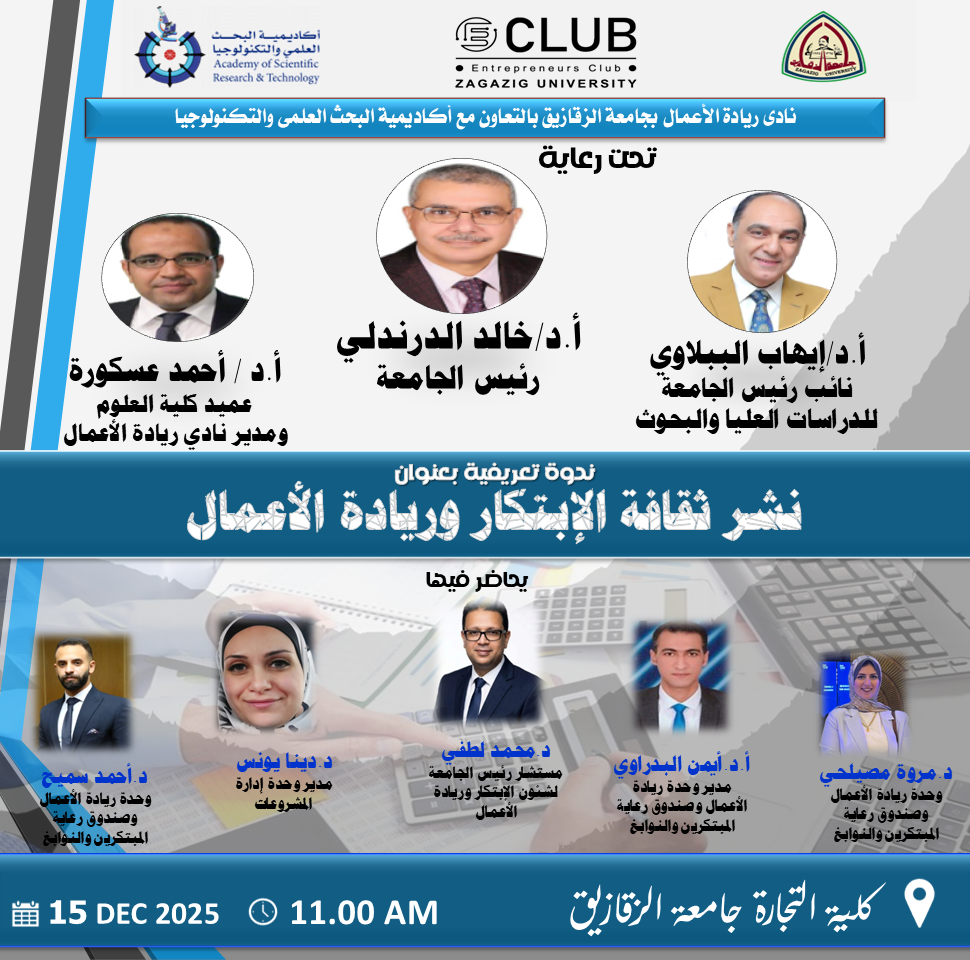 دعماً لريادة الأعمال ندوة تعريفية بعنوان نشر ثقافة الإبتكار وريادة الأعمال بكلية التجارة